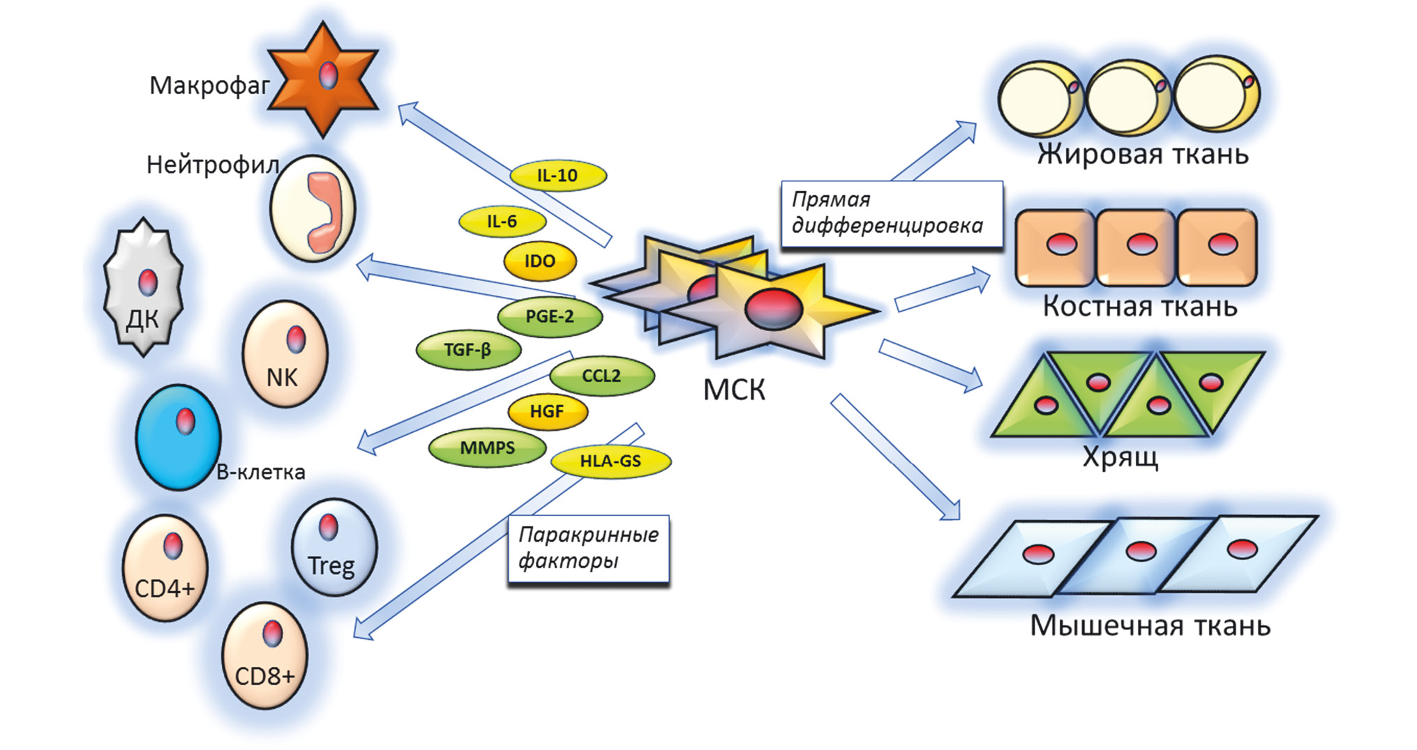 Рис. 1. Общие эффекты МСК, сгруппированные по двум основным механизмам: прямая клеточная дифференцировка рекрутированных МСК (в клетки жировой, костной, хрящевой и мышечной ткани) для замены поврежденных клеток и индукция цитокинов, секретируемых МСК в воспалительную среду, влияющих на иммунную систему организма реципиента (IL-6 — интерлейкин-6; PGE2 — простагландин E2; TGF-β — β-трансформирующий фактор роста; IDO — индоламин-2,3-диоксигеназа; CCL-2 — С-С-хемокиновый лиганд 2; IL-10 — интерлейкин-10; HGF — фактор роста гепатоцитов; MMP — матричные металлопротеиназы; HLA-G — человеческий лейкоцитарный антиген-G). Адаптировано из [7].