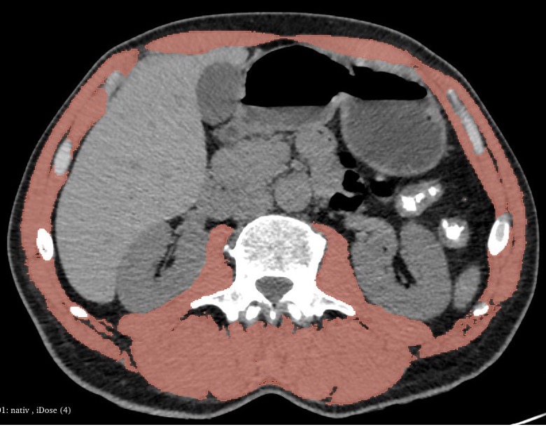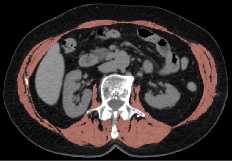 Fig. 2. Preoperative CT scan of a patient with sarcopenia (muscle area 44.5 cm², musculoskeletal index 17 cm²/m²). Muscle tissue is highlighted in red. Axial projection, soft tissue window.