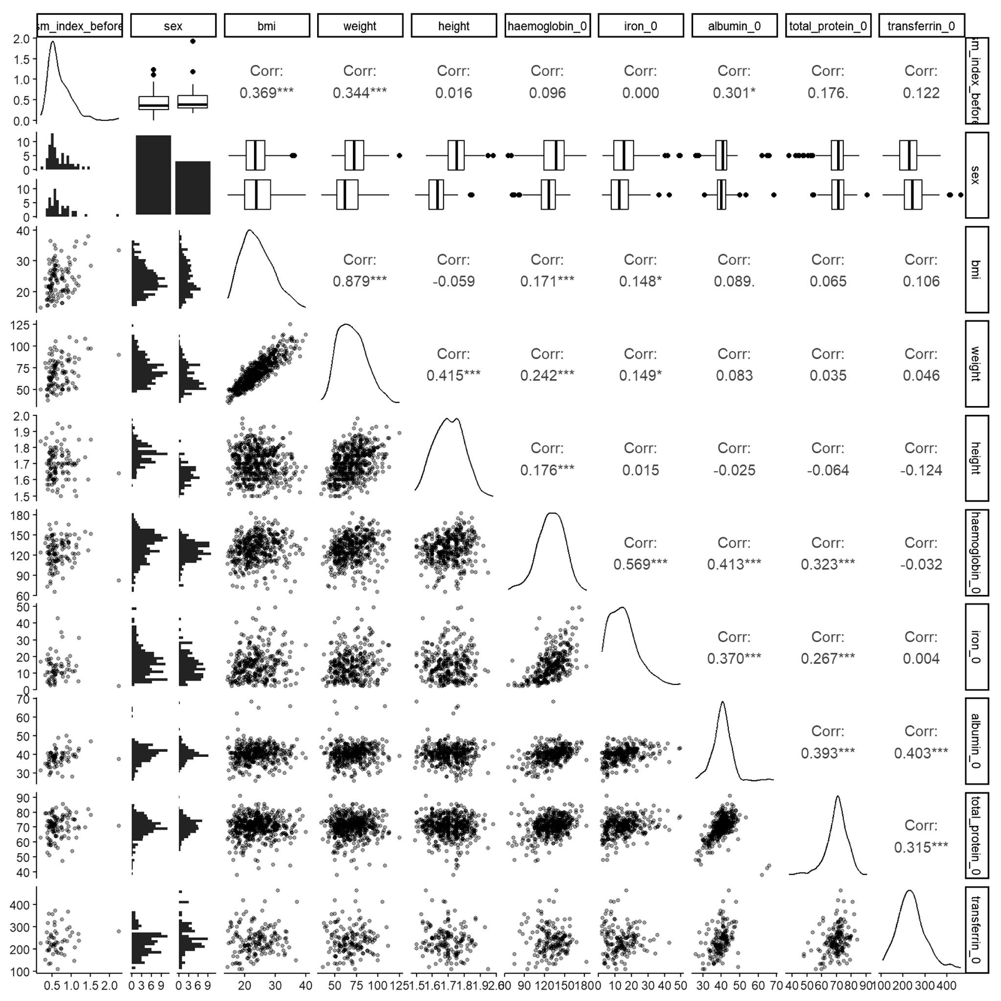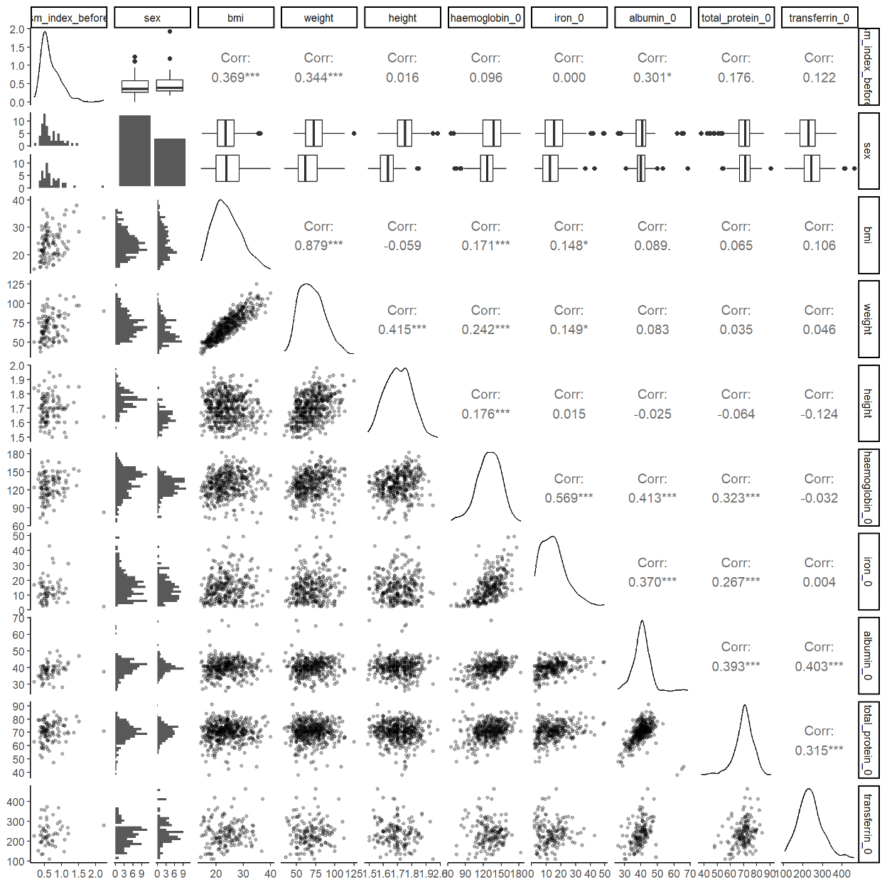Fig. 3. Pairwise scatterplots and Pearson correlation coefficients for risk factors for complications in general. sm index before — musculoskeletal index; sex — gender; bmi — body mass index; weight — body weight; height — height; haemoglobin — hemoglobin; iron — iron; albumin — albumin; total protein — total protein; transferrin — transferrin.