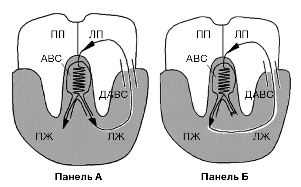 Примечание. Здесь и на рис. 3: ЛЖ/ПЖ — левый/ правый желудочек; АВС/ДАВС — атриовентрикулярное / дополнительное атриовентрикулярное соединение.