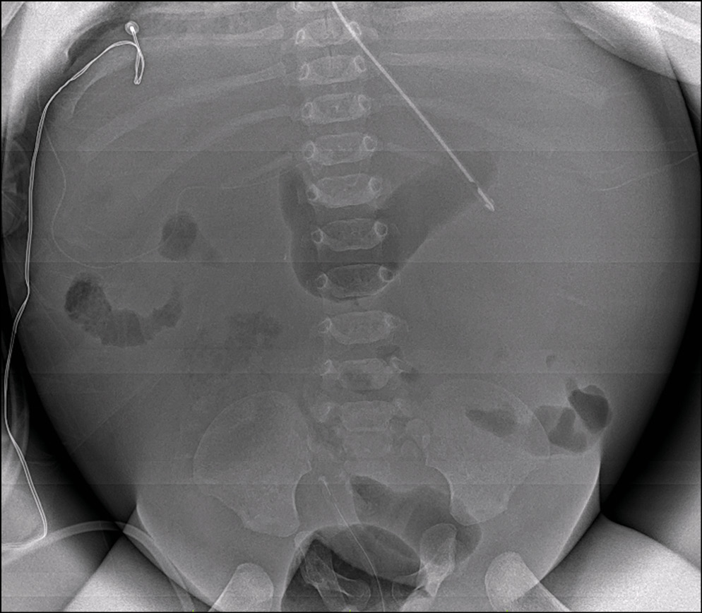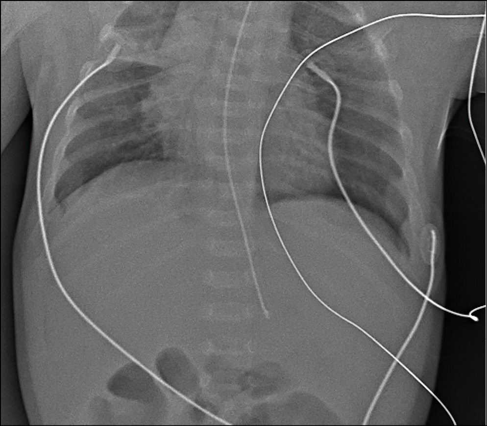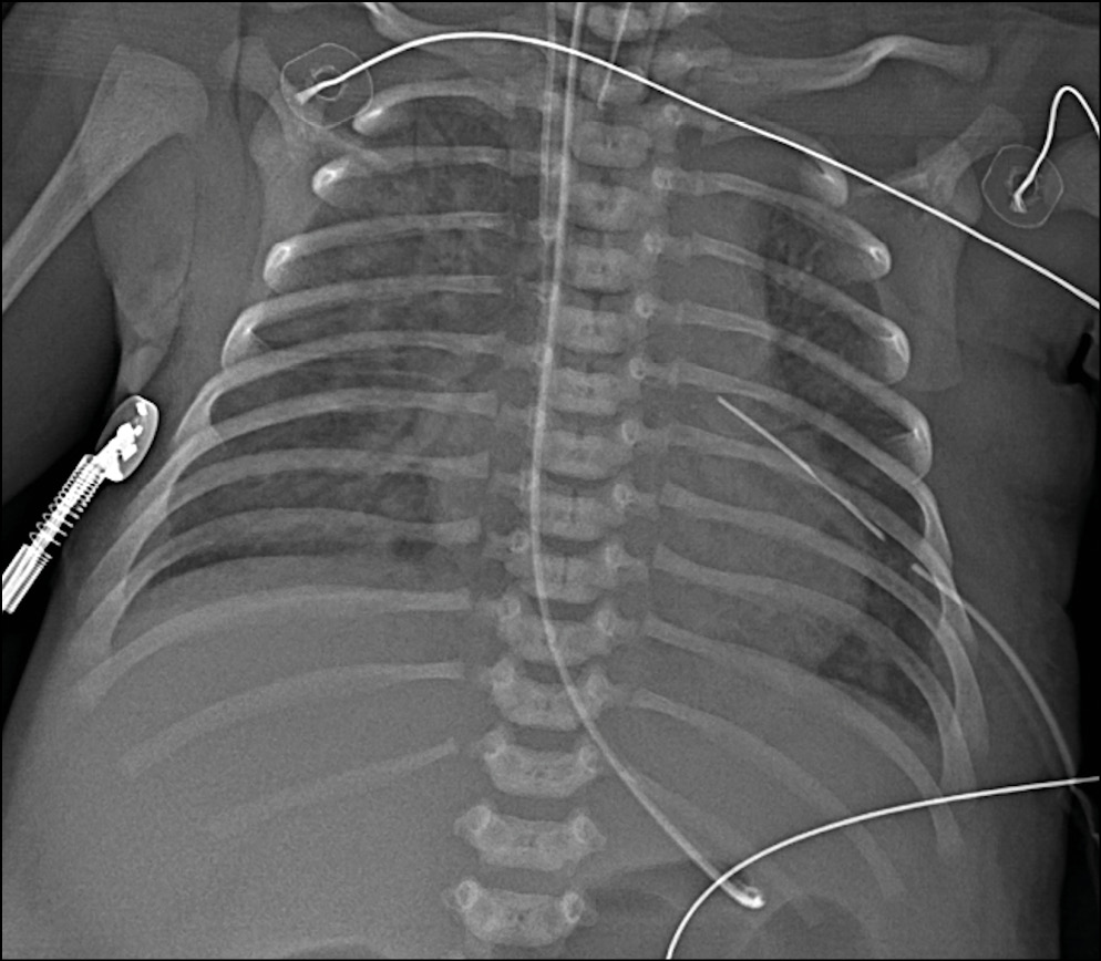 Рентгенография органов грудной клетки традиционно является наиболее важной в оценке легочной паренхимы у детей раннего возраста: зачастую лечащие врачи назначают выполнение торакоабдоминальной рентгенограммы для одномоментного исследования органов грудной и брюшной полости. Наиболее важной задачей при исследовании органов грудной клетки является непосредственно оценка паренхимы легких, ее пневматизация и наличие участков затенения. Необходимо отметить изменения со стороны легочного рисунка — усиление, сгущение, деформацию или его обеднение. Необходимо оценить уровень положения диафрагмы и состояние реберно-диафрагмальных синусов, а также положение зондов, дренажей и катетеров (рис. 2).
