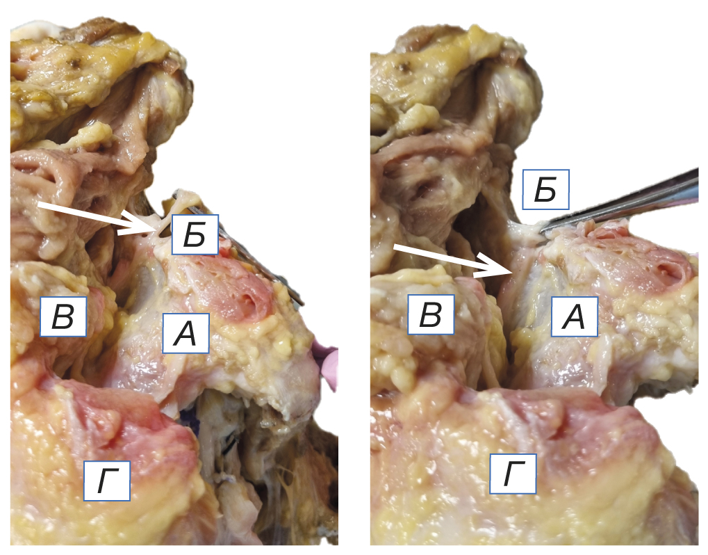 The suprascapular nerve compression syndrome is to a great extent caused by the complex anatomical structure of the nerve itself, which is formed by the branches of the upper trunk of the brachial plexus [6–8], innervating the supraspinal and the infraspinous muscles, the acromioclavicular joint, the skin of the posterior surface of the shoulder. Within the structure of the suprascapular nerve, there are two possible areas of entrapment — the area of the suprascapular notch (Fig. 1) and the area of the spinoglenoid notch [9]. The variant of the anatomical structure of the suprascapular notch can be the reason of possible compression of the suprascapular nerve. There are six types of the suprascapular notch structure: type 1 — recess; type 2 — shallow V-shaped notch; type 3 — U-shaped notch; type 4 — deep V-shaped notch; type 5 — U-shaped notch with partial ossification of the ligament; type 6 — complete ossification of the transverse ligament [10]. Specifically this anatomical variant determines the complexity of diagnostics of suprascapular neuropathy, which more often develops in cases of type 5 and type 6 scapular anatomy variants.