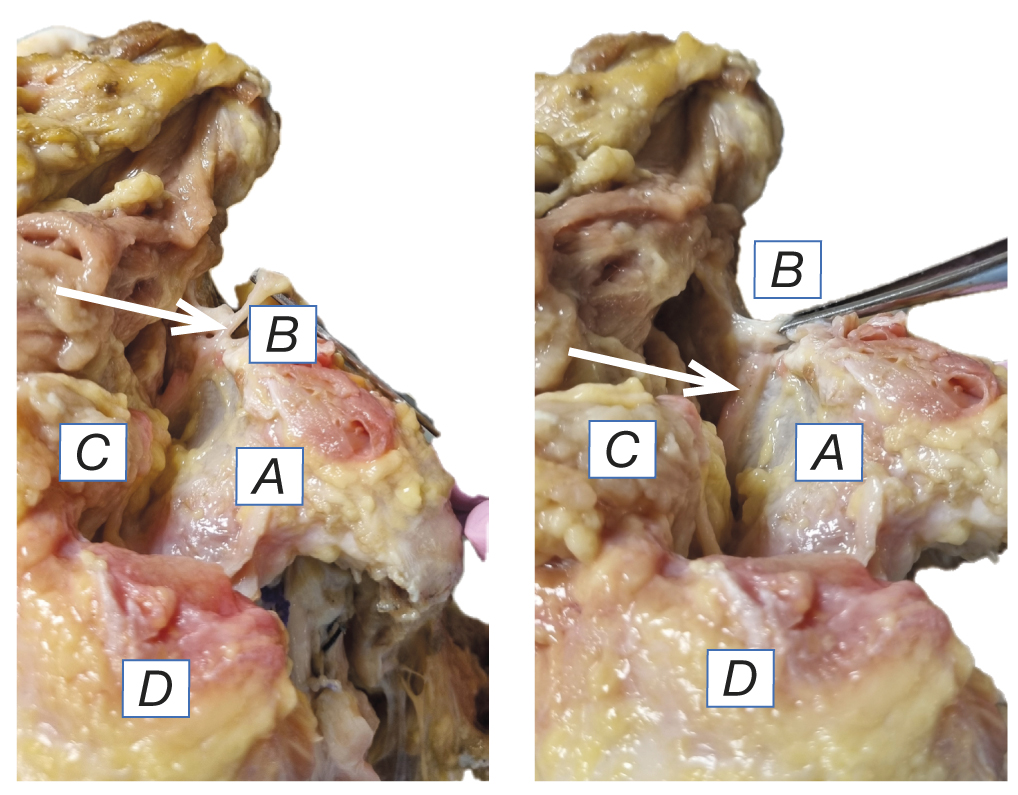 Fig. 1. The area of the suprascapular ligament. The scapula (A), the transverse ligament of the scapula (B), which is dissected on the left and intact on the right, the diverted supraspinatus muscle (C), the acromion (D). The arrow indicates the suprascapular nerve.