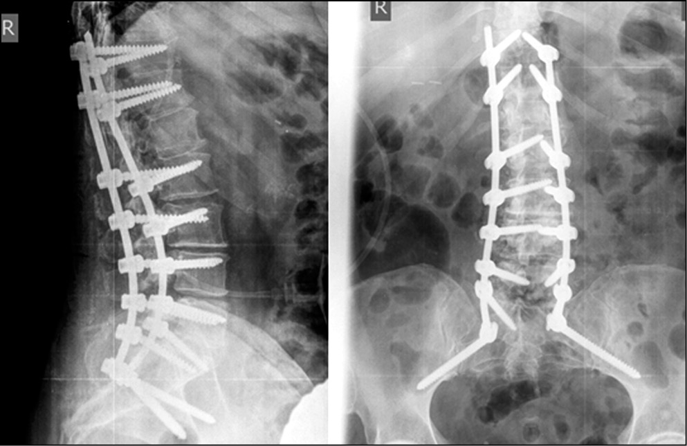 - остеопороз может ослабить прочность фиксации, что приводит к потере коррекции и развитию псевдоартрозов. Сегментарная фиксация и поддержка передней колонны могут усилить фиксацию, а использование цементной аугментации для транспедикулярных винтов препятствует их расшатыванию. Используя данную методику, сначала необходимо ввести костный цемент в ТП, после чего установить винты для транспедикулярной фиксации [44];