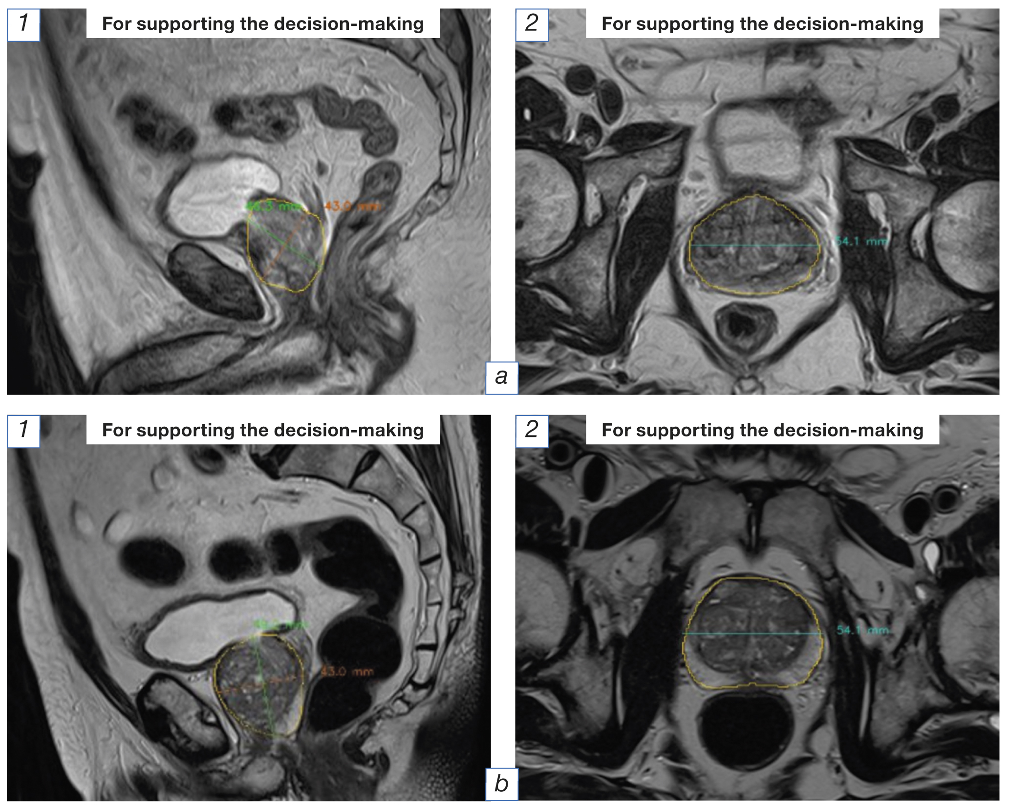 Fig. 2. The results of magnetic resonance imaging of the lesser pelvis organs in males aged 65 (а) and 67 (b) years, analyzed by the AI-service: segmentation and morphometry of the prostate gland were done correctly. 1 — sagittal projection; 2 — axial projection.