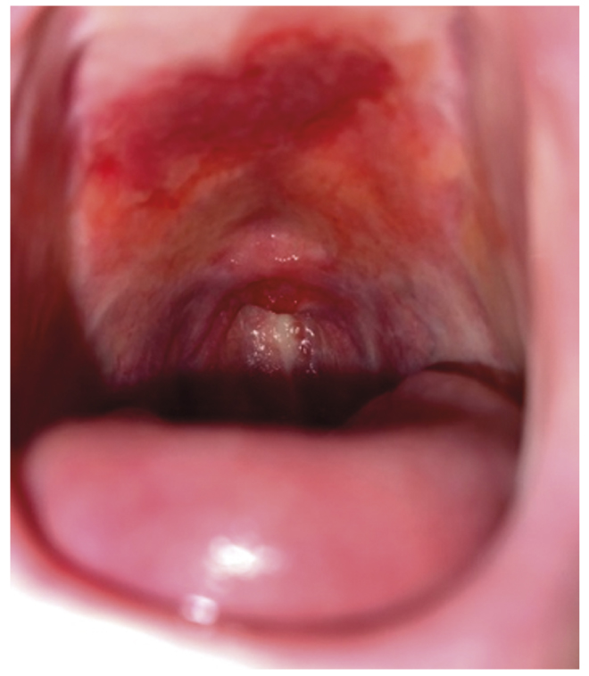 The physical status of the patient corresponded to class II–III of the scale by the American Society of Anesthesiologists (ASA). The surgical intervention, by its extent and type, was considered as the surgery with moderate traumatic degree. Preoperative evaluation of the status of the upper airways has revealed the risk factors of difficult mask ventilation according to the MMMMASK scale (Mask seal due to the absence of teeth; Mallampati — class IV), difficult installation of the supraglottic air tube according to the RODS scale (R — limited opening of the mouth) and difficult direct laryngoscopy. The criteria for difficult airways were also determined: mouth opening — 2.9 cm (microstomia) (Fig. 1), large tongue, complete edentia, thyromental distance — 6 cm, sternomental distance — 9 cm, hyomental distance — 4.5 cm, Mallampati test — IV (Fig. 2), presence of chronic erosions in the oral cavity (Fig. 3).