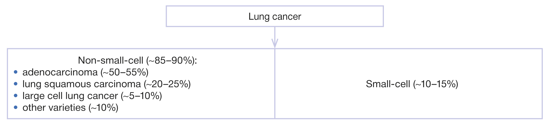 Subtypes | Adenocarcinoma, squamous, large cell | Pure SCLC, combined (with elements of NSCLC) | [1] |
