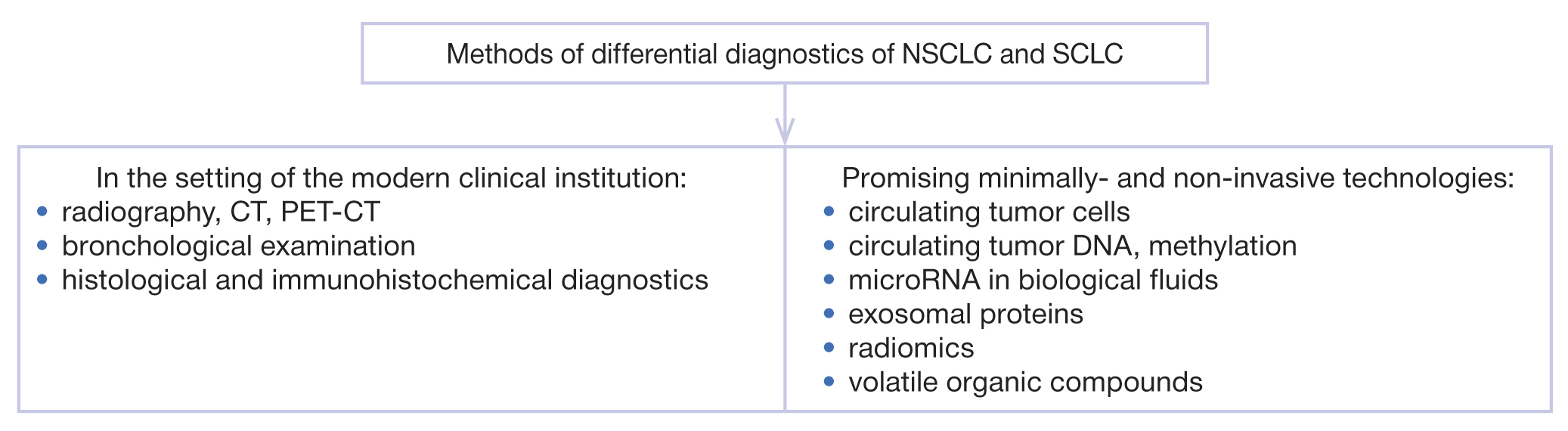 Lung cancer represents a heterogeneous group of malignant neoplasms, among which two main forms can be distinguished — the non-small-cell and the small-cell lung cancer. These subtypes significantly differ by the histological, the molecular-genetic and the clinical characteristics, which defines the necessity of precise differential diagnostics for selecting the optimal treatment tactics. The review highlights the modern methods of diagnostics for the non-small-cell and the small-cell lung cancer, including the instrumental diagnostics, the histological and immunohistochemical examinations. Special attention was paid to the pros and cons of the promising non- and minimally invasive approaches, such as the analysis of circulating tumor cells, of the extracellular DNA, of the miRNA, of the marker proteins, of the volatile organic compounds and of the modern medical visualization (radiomics). Despite the significant progress in developing new diagnostic approaches, the problems remain that are related to the heterogeneity of tumors, the limited accessibility of the materials of small-cell lung cancer and the necessity of standardizing the new methods. The promising direction seems to the integration of multimodal approaches, combining the fluid biopsy, radiomics and the algorithms of machine learning, which can increase the precision of diagnostics and optimize the personalized treatment of the patients with various subtypes of lung cancer.