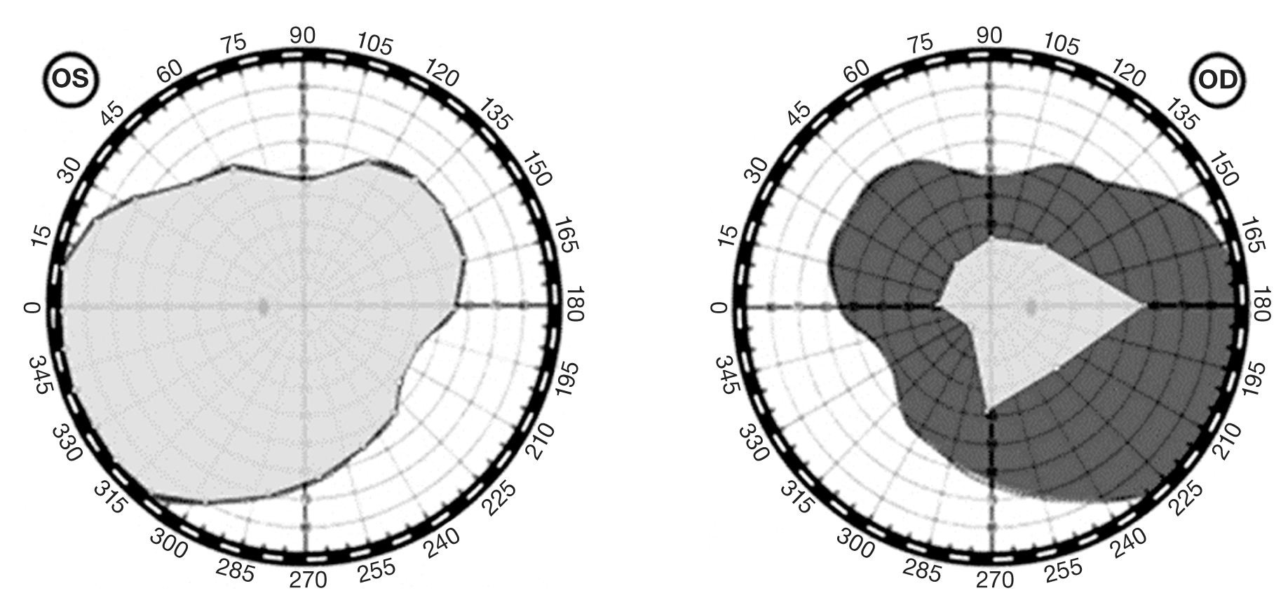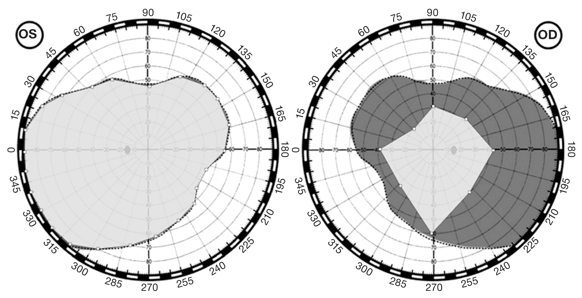 Fig. 1. The kinetic spheroperimetry upon the initial examination: the detected findings include a narrowing of the vision field margins in the right eye (OD), more in the temporal and the nasal meridians, the left eye (OS) is unremarkable.