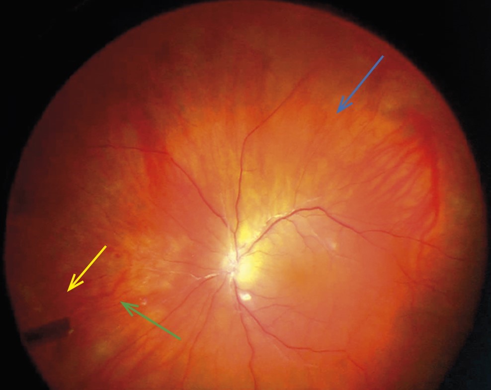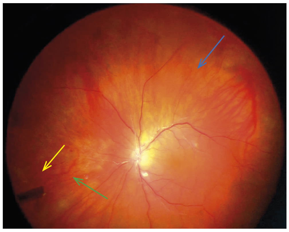 Fig. 3. Intraoperative photography image of the ocular fundus of the right eye: desolation of the vessels in the lower-temporal arcade (blue arrow), hemorrhages (yellow arrow) and microaneurisms (green arrow) in the nasal meridians in the close and the middle periphery of the ocular fundus.