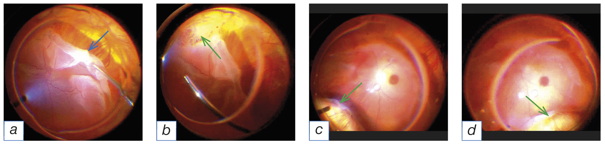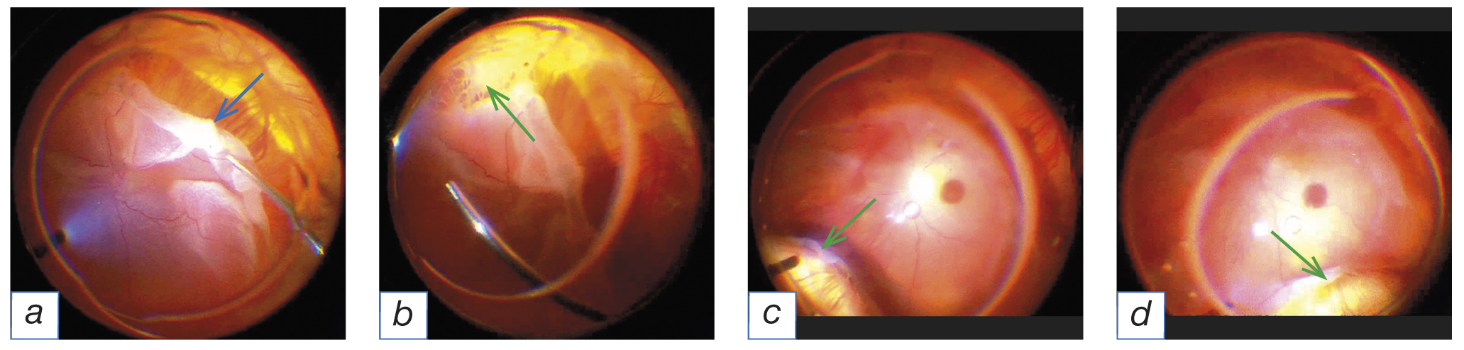 Fig. 5. Intraoperative (2 weeks after surgical intervention) photography images of the posterior segment of the right eye: a — total retinal detachment with a tear at 5–9 o’clock from the ora serrata (blue arrow); peripheral necrosis of the retina along the ora serrata (green arrow): b — lower-internal quadrant; c — upper-internal quadrant; d — upper-external quadrant.