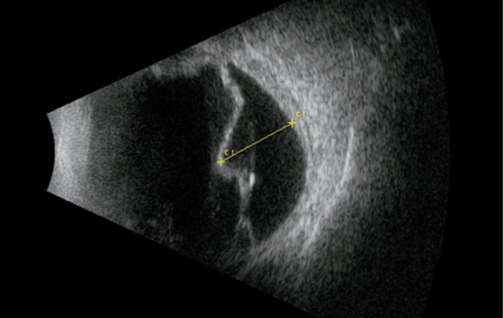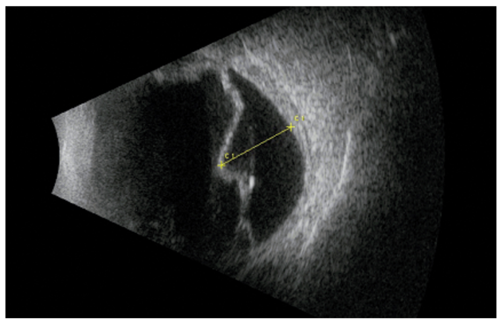 Fig. 6. Ultrasound examination of the right eye 2 weeks after surgery: total retinal detachment is observed in all the meridians at the close, the middle and the marginal periphery with a retinal tear from the ora serrata at the 5–9 o’clock meridian, with a height of up to 8 mm, the retina is mobile.