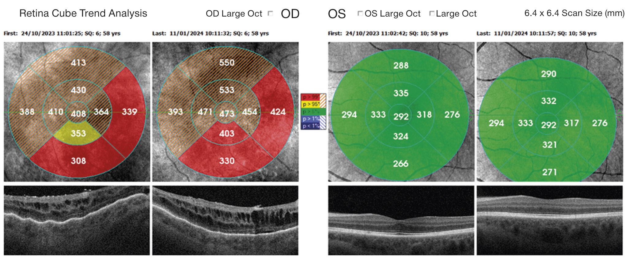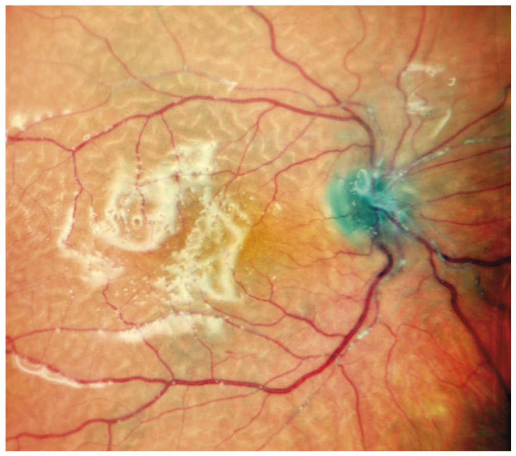 After the conducted conservative and operative ophthalmology treatment, as well as after the treatment prescribed by the Infectious Disease Physician, the patient, from the beginning of 2024 and to the present day, during the periodical control check-ups, has her BCVA values in the right eye varying within the range of 0.1–0.2, the intraocular pressure measured using the Maklakov’s method (10 g weight) was 15–16 mm.Hg.; the anterior-posterior dimension of the right eye, according to the data from optic biometry, in 2025 was 21.63 mm. The field of vision in the right eye has changed insignificantly with no clear negative changes. Ophthalmoscopically and according to the data from the optical coherence tomography, there is a persisting cystoid intraretinal edema, tangential traction syndrome; the pre-retinal membrane in the right eye has no negative changes; the retina is attached in all the meridians. The left eye shows no signs of abnormalities.