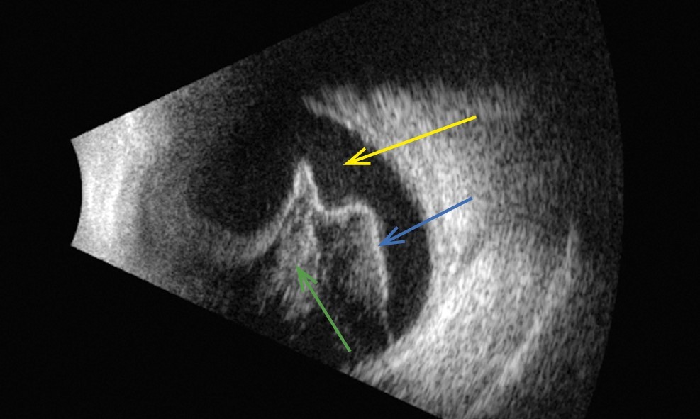 Fig. 2. Ultrasound examination of the right eye: multiple inclusions were found, visualized as bodies, flakes (yellow arrow), strands and adhesions of various echogenicity (green arrow), non-fixated posterior detachment of the vitreous body (blue arrow).