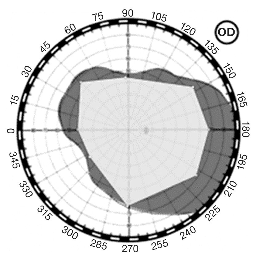 On the next day after surgery, the female patient was discharged with positive changes for further out-patient treatment with the recommendation to undergo an examination at the infectiologist’s office. On discharge, the BCVA of her right eye was 0.75; pneumotonometry — 11 mm.Hg.; the vision field, according to the data from kinetic spheroperimetry, has increased (Fig. 4).