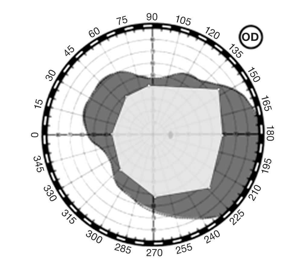 After an examination, the best corrected visual acuity (BCVA) in the right eye (oculus dexter, OD) was 0.2, while in the left one (oculus sinister, OS) — 0.9–1.0; the pneumotonometry values were 29 and 23 mm.Hg.; the anterior-posterior dimensions of the eyes according to the data from optic biometry were 23.06 mm and 22.9 mm, respectively. The data from the kinetic spheroperimetry are provided in Fig. 1.