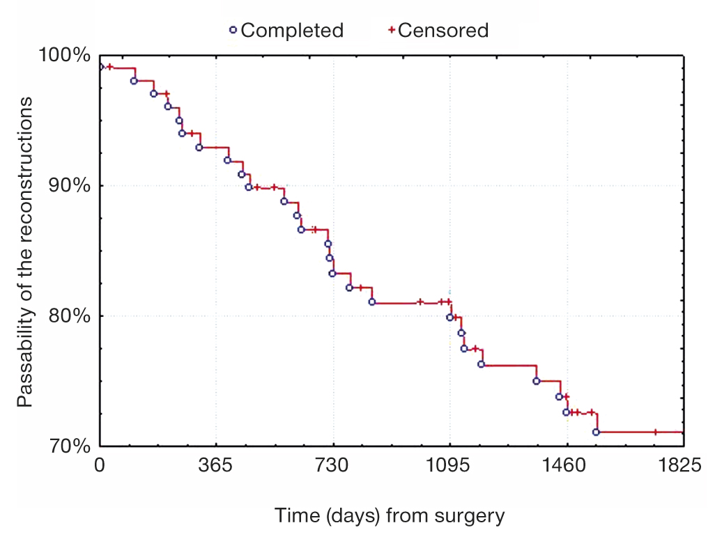 The remote results included the primary and the secondary passability, the limb survival and the overall survival. The primary passability of the tibiofibular autovenous bypasses was 91%, 76% and 67% in 1, 3 and 5 years (p <0.05), while the secondary passability of the bypasses — 93%, 80% and 71%, respectively (p <0.05) (Fig. 1, 2). The value of the limb survival parameter among the patients was 98%, 86% and 81.5% in 1, 3 and 5 years (p <0.05) (Fig. 3), the overall survival of the patients — 88.5%, 81% and 70%, respectively (p <0.05) (Fig. 4).