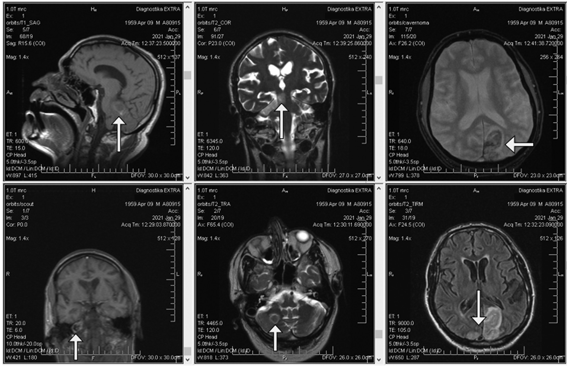 Когнитивные нарушения. Основой их развития и прогрессирования являются сохраняющаяся гипоперфузия мозга; нарушения метаболизма; индуцированное вирусом структурное повреждение нейронов (страдают в той или иной степени отделы мозга, обеспечивающие фиксацию и сохранение памяти, — кора височных, затылочных долей, гиппокамп, миндалевидные ядра, таламус, мозжечок); вторично нарушается функционирование нейрохимических механизмов восприятия, усвоения, консолидации информации, необходимой для обеспечения психической, интеллектуальной деятельности индивидуума [85, 86]. Больные с нейрокогнитив-ным дефектом предъявляют жалобы на возникшие проблемы с памятью (усвоение новой информации, понимание, воспроизведение увиденного, услышанного, прочитанного), выполнением повседневной деятельности, общением с окружающими. При оценке нейропсихологического тестирования и двигательной активности выявляются дефекты коммуникативности, внимания, узнавания, понимания, мышления, моторики, запоминания, воспроизведения ряда слов, цифр, фигур. Страдают приспособительное поведение, работоспособность, познавательная деятельность, осмысливание, эпизодическая, процедурная, семантическая, оперативная, фиксационная, кратковременная память, управление финансами, взаимоотношения в семье [87, 88]. Когнитивные нарушения не связаны с приемом лекарств, критическая самооценка когнитивного потенциала сохраняется, степень снижения — в диапазоне от легких до умеренно выраженных нарушений [89, 90]. При выявлении на магнитно-резонансной томограмме (МРТ) и в ликворе маркеров нейродегенеративного процесса, возникшие изменения в когнитивной сфере являются недементны-ми [91, 92], вместе с тем присутствие и репликация коронавируса в структурах и органоидах мозга, наличие «тлеющего» воспалительного процесса, стимулирующего отложение бета-амилоида и тау-белка в нейронах височной доли, относятся к значимым факторам развития болезни Альцгеймера у перенесших COVID-19 и прогрессирования ее, у кого она уже есть [93, 94].