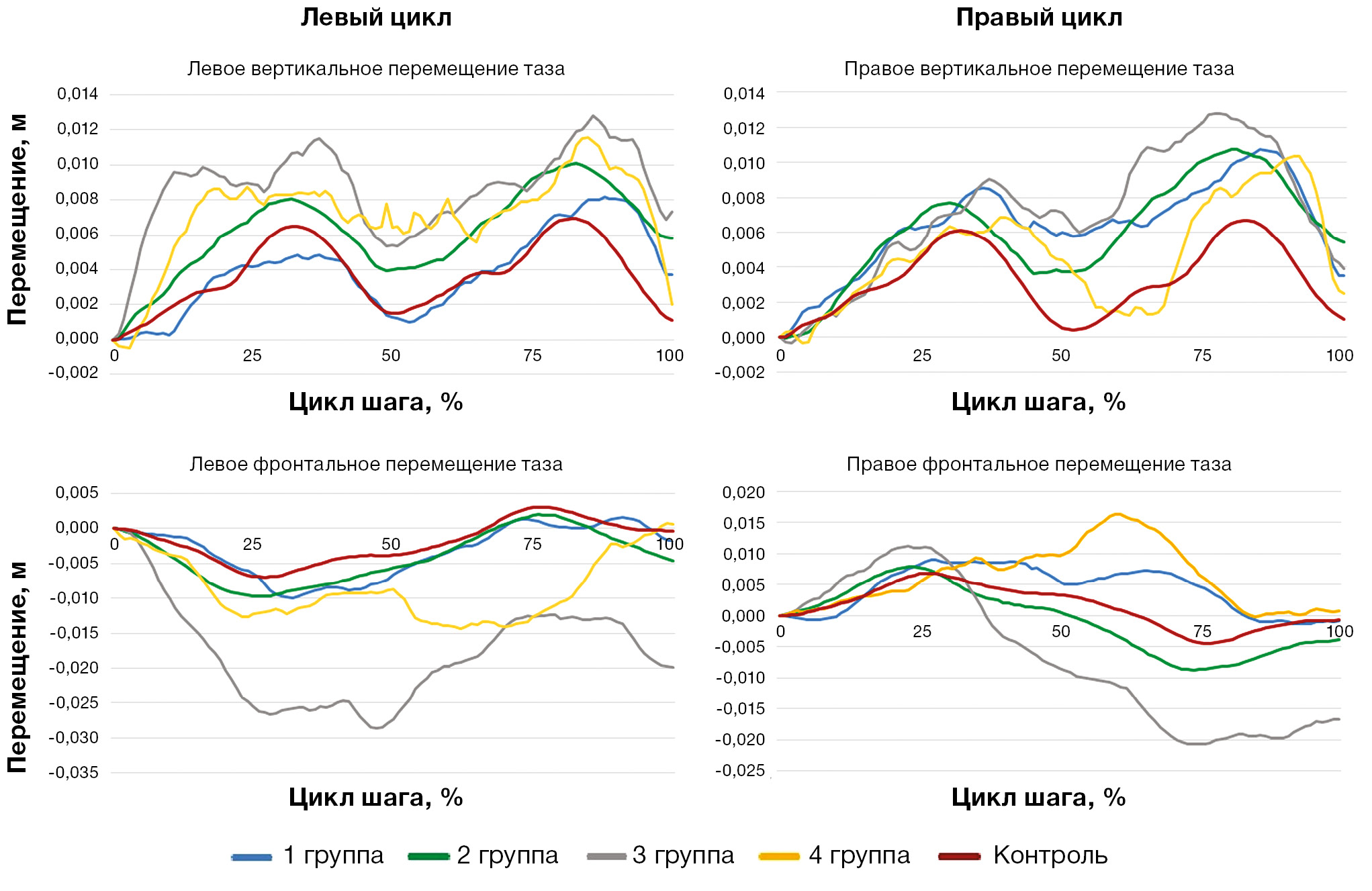 Фронтальные перемещения таза за ЦШ представляют собой синусоиду с максимумом вправо или влево в зависимости от аналогичных циклов. Для левого ЦШ имеются достоверные отличия от контрольной группы во второй, третьей и четвертой группах. В силу того, что по данным параметрам имеются значительные отличия в группах, то все кривые достоверно отличаются от друг от друга и графика контрольной группы (р <0,05).