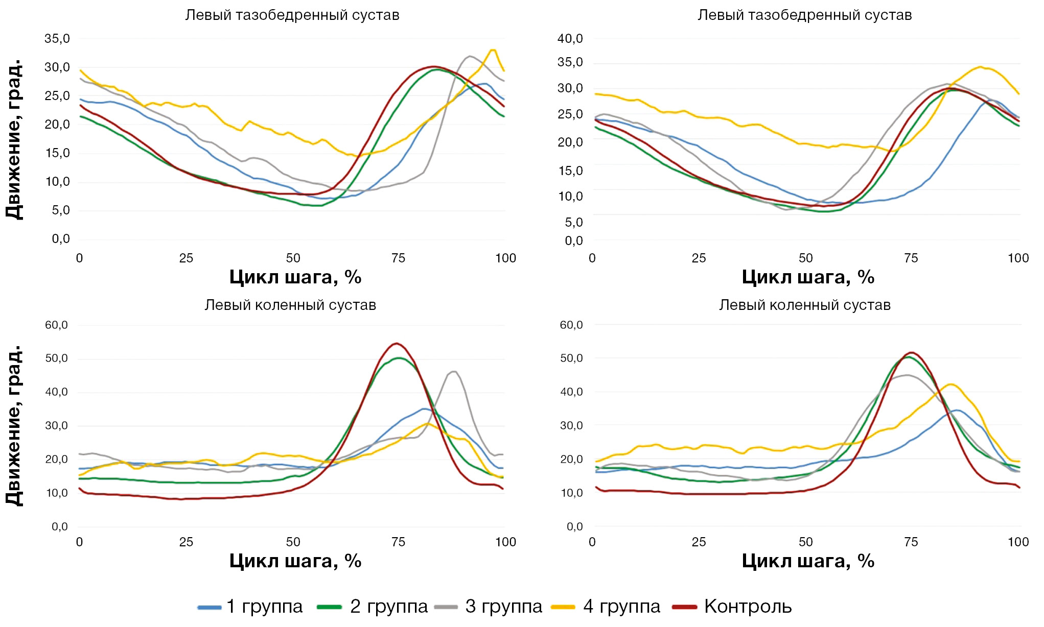 Для движений в коленных суставах характерно достоверное отличие всех обследуемых групп от контрольной, при этом для правого коленного сустава в четвертой группе движения достоверно отличаются от других групп пациентов. Для левого коленного сустава только четвертая группа имеет достоверные отличия от первой.