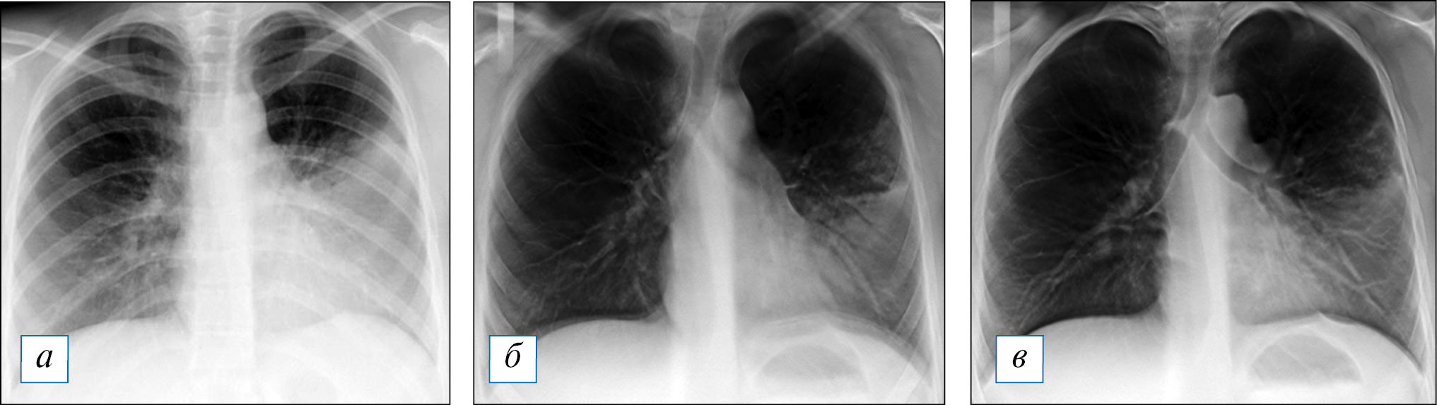 Рис. 1. Результаты лучевого обследования пациентки К., 16 лет, на 6-е сут заболевания. Первично рентгенографически (а) диагностирована верхнедолевая пневмония. По результатам томосинтеза (б, в), выполненного также на 6-е сут заболевания, зона затемнения захватывает всю нижнюю долю левого легкого; подозрение на формирование деструктивных очагов в сегментах 4 и 5 слева стало поводом для пересмотра (расширения) схемы эмпирической антибактериальной терапии. / Fig. 1. Results of X-ray examination of the patient K., 16 years old, 6th day of the onset of disease. Primary radiografically was diagnosed upper lobe pneumonia (a). According to the results of tomosynthesis (б, в), also performed on the 6th day of the disease, the zone of the blackout captures the entire lower lobe of the left lung; destructive foci in segments 4 and 5 of the left lung (under suspicion). These data were the reasons for the revision (expansion) of the empirical antibacterial therapy.