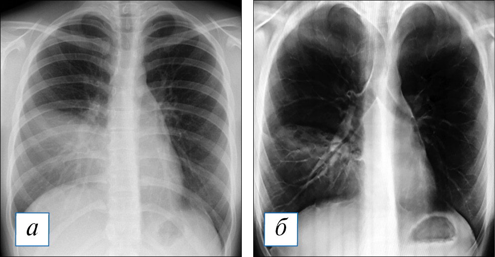 Рис. 2. Результаты лучевого обследования пациентки А., 16 лет. При рентгенографии (а) на 4-е сут заболевания диагностирована нижнедолевая пневмония справа. В ходе томосинтеза (б) визуализированы очаги деструкции в виде округлых очагов просветления в нижней и средней доле справа, число, размер и локализация которых были впоследствии подтверждены методом мультиспиральной компьютерной томографии. / Fig. 2. Results of the X-ray examination of the patient A., 16 years old. Radiografically on the 4th day of the onset of disease was diagnosed lower lobe pneumonia on the right (a). During tomosynthesis (б), foci of destruction were visualized round foci of enlightenment in the lower and middle lobes on the right lung. The number, size and localization of which were confirmed by multispiral computed tomography later.