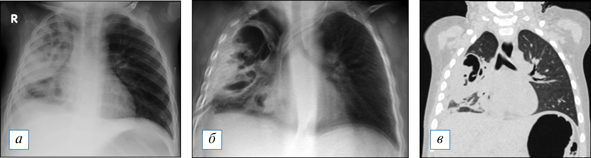 Рис. 3. Результаты проведенного в сопоставимые сроки лучевого обследования пациента Д., 1 год 8 мес, с субтотальной правосторонней деструктивной пневмонией: а — рентгенография; б — томосинтез; в — мультиспиральная компьютерная томография. / Fig. 3. Results of the different examination in comparable periods of the patient D., 1 year 8 months, with subtotal right-sided destructive pneumonia: a — radiography; б — tomosynthesis; в — multispiral computed tomography.