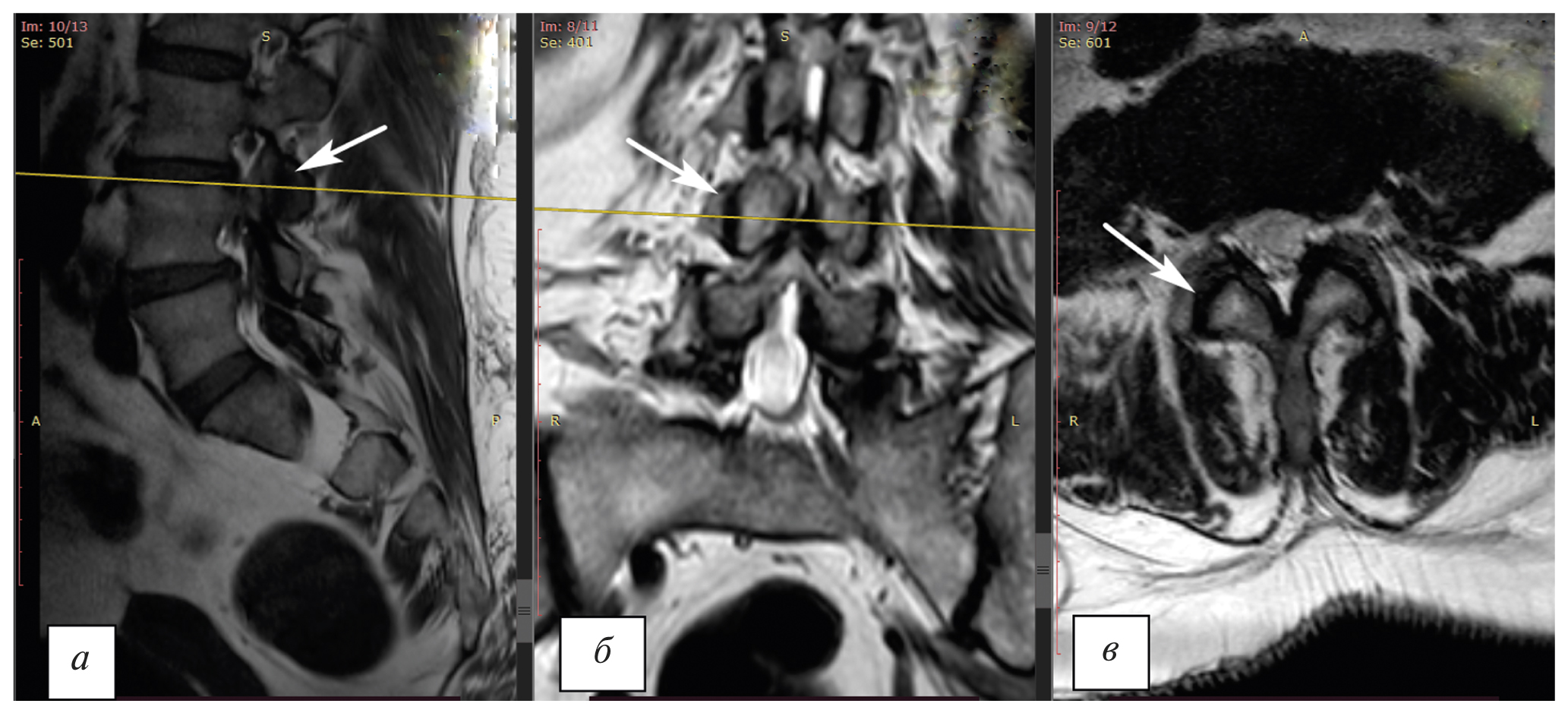Рис. 1. Магнитно-резонансная томография поясничного отдела позвоночника: а — Т1-взвешенное изображение в сагиттальной проекции (гипоинтенсивный сигнал суставной щели гипертрофированных дугоотростчатых суставов LIII–LIV, стрелка); б — Т2-взвешенное изображение во фронтальной проекции (гипоинтенсивный сигнал суставной щели гипертрофированных дугоотростчатых суставов LIII–LIV, стрелка); в — Т1-взвешенное изображение в аксиальной проекции (гипоинтенсивный сигнал суставной щели гипертрофированных дугоотростчатых суставов LIII–LIV, стрелка). Тяжесть дегенеративных изменений в зигапофизарном суставе LIII–LIV справа соответствует IV степени по классификации A. Fujiwara. / Fig. 1. Magnetic resonance imaging of the lumbar spine: а — a T1-weighted image in the sagittal projection (a hypointensive signal of the articular gap of hypertrophied LIII–LIV arch-process joints, arrow); б — a T2-weighted image in the frontal projection (a hypointensive signal of the articular gap of the hypertrophied LIII–LIV arch–process joints, arrow); в — a T1-weighted image in the axial projection (hypointensive signal of the articular gap of the hypertrophied LIII–LIV arch-process joints, arrow). The severity of degenerative changes in the zygapophyseal LIII–LIV joint on the right corresponds to the IV degree according to A. Fujiwara’s classification.