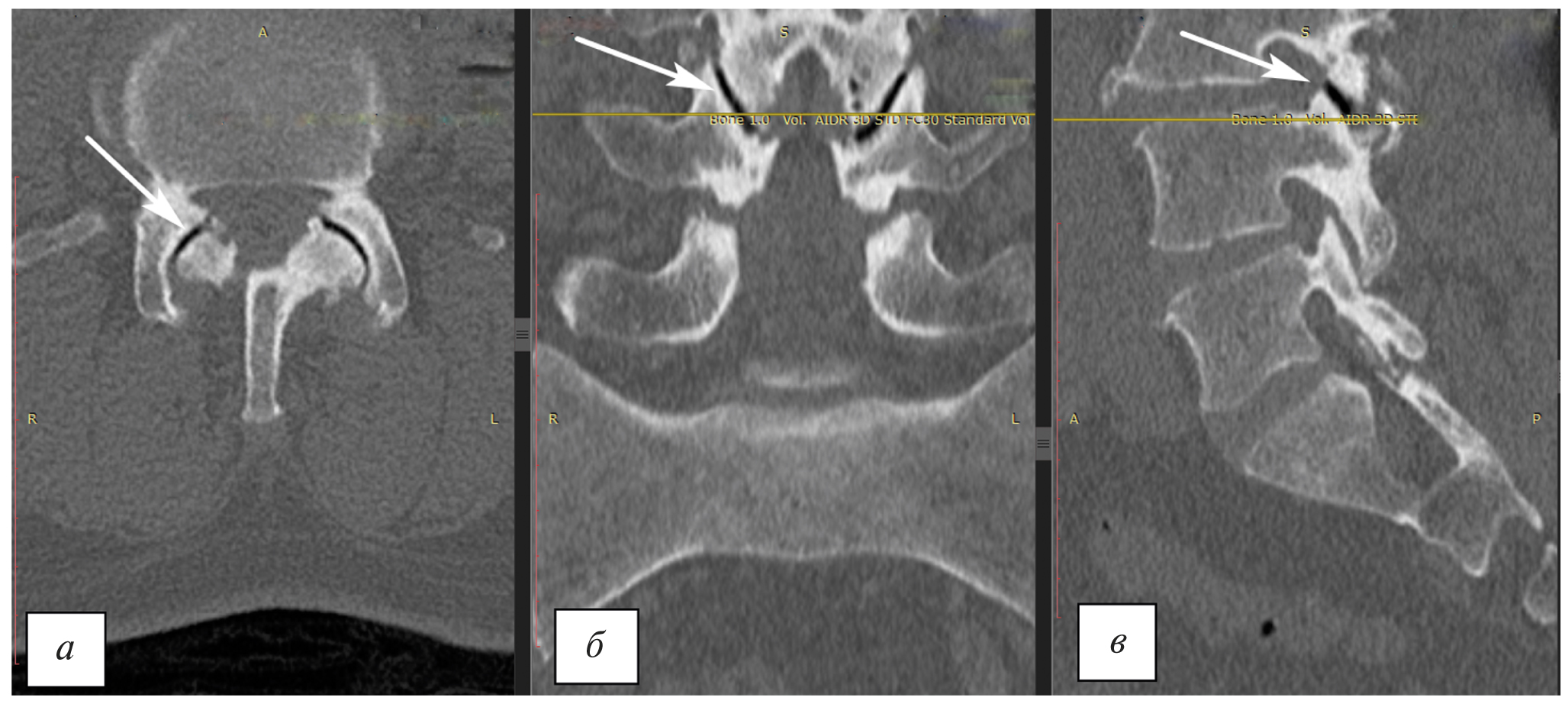 Рис. 2. Мультиспиральная компьютерная томография поясничного отдела позвоночника: а — аксиальная проекция; б — фронтальная проекция; в — сагитальная проекция. Стрелками указан гипертрофированный дугоотростчатый сустав LIII–LIV справа с явлением «вакуум-эффекта». / Fig. 2. Multispiral computed tomography of the lumbar spine: а — axial projection; б — frontal projection; в — sagittal projection. The arrows indicate the hypertrophied zygapophyseal LIII–LIV joint on the right with the phenomenon of the “vacuum effect”.
