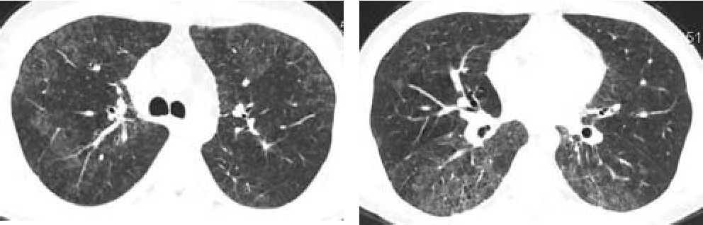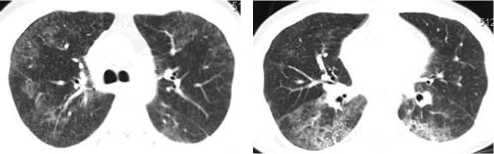 По данным компьютерной томографии органов грудной клетки (рис. 1,2), у пациента имелись признаки, характерные для текущего интерстициального поражения легких.