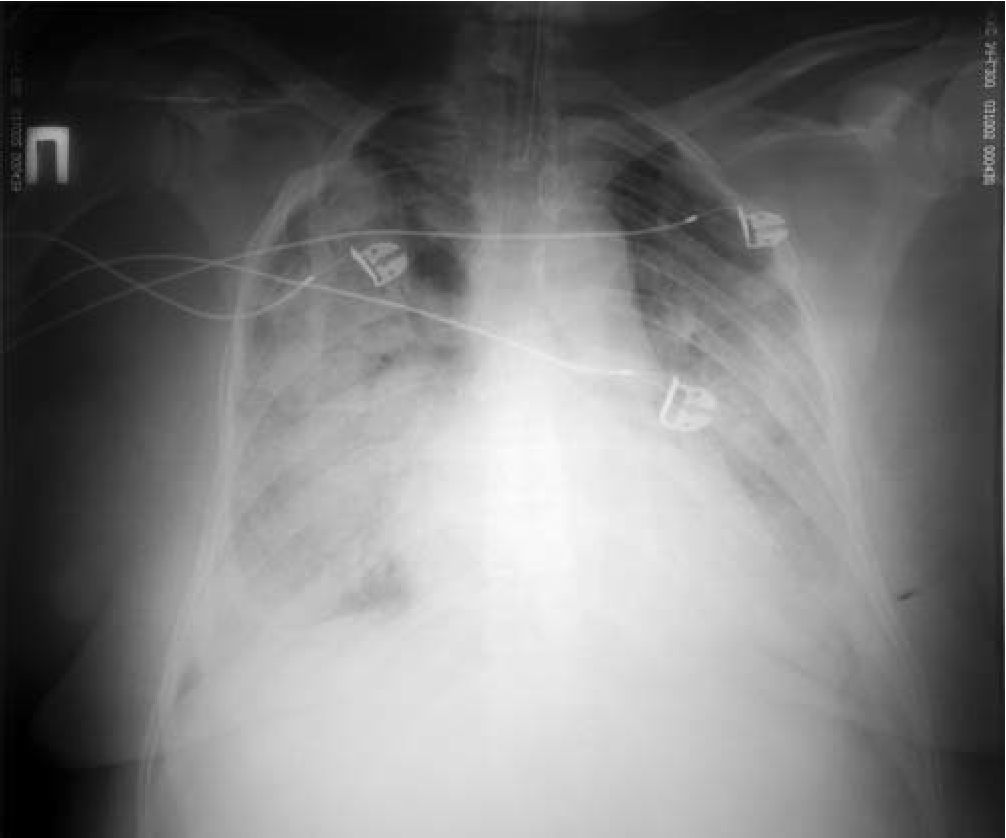 При рентгенографии в условиях ИВЛ выявлена интенсивная инфильтрация легочной
