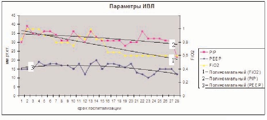 - Проводить динамическую оценку сознания и ощущаемого больной дыхательного комфорта в условиях ИВЛ как клинического показателя ее состоятельности (частота смены параметров ИВЛ в первые дни достигала 10-15 раз в сутки).