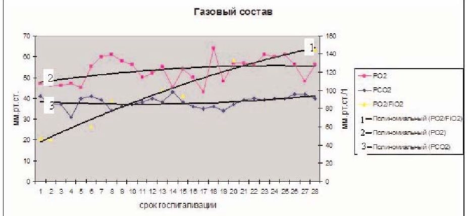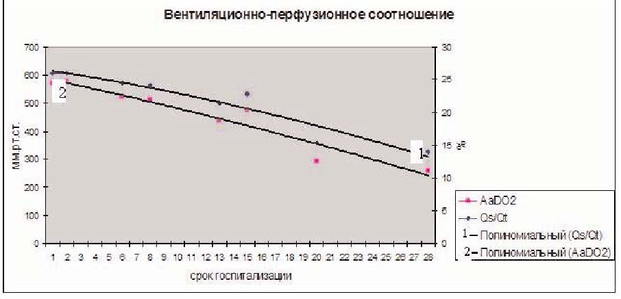 По мере купирования инфильтрации в легких на этапе отлучения от респиратора достаточно долго сохранялась физическая и психологическая зависимость от кислорода и респиратора. Результаты последующего контрольного обследования подтвердили клинический диагноз формирующегося пневмофиброза, что потребовало специальной реабилитационной терапии. Общая продолжительность респираторной поддержки составила 56 дней. Имея определенный опыт использования гелий-кислородных смесей при некоторых заболеваниях легких, мы в процессе длительной ИВЛ у данной больной, к сожалению, по ряду причин применить его не смогли.