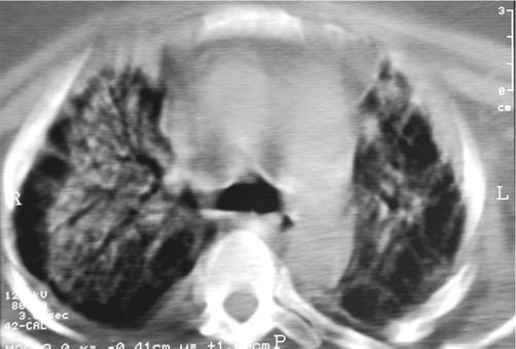 ткани во всех отделах легких с небольшой зоной сохранившейся пневматизации в верхних зонах, корни не визуализируются. Сердце расширено в поперечнике (рис. 1).