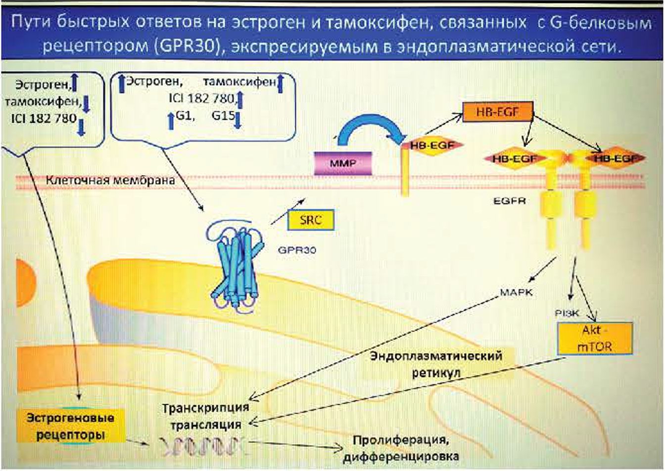 Положительный клинический эффект тамоксифена напрямую связан с блоком геномных лиганд-зависимых эффектов в рецептор-положительном РМЖ, но в других эстроген-зависимых тканях, или при неблагоприятных условиях, тамоксифен может вызывать эстроген-подобный эффект и гиперпролиферацию через активацию комплекса G-белок рецептора эстрогена GPR30 ('негеномный эффект). Например, у пациенток с ожирением хроническая активация комплекса эстроген/ инсулин/инсулиноподобный фактор роста, приведет к высокой активности лиганд-независимых эффектов, и через комплекс G-белок рецептора эстрогена GPR30 — к опосредованной стимуляции мембранных рецепторов эпидермального фактора роста (EGFR), что, в свою очередь, стимулирует быстрое фосфорилирование и активирует МАРК ERK1 / 2 сигнал или фосфатидилинозитол-3-киназный путь (Р13К), т.е. возникает высокая трансляционная и транскрипторная активность.