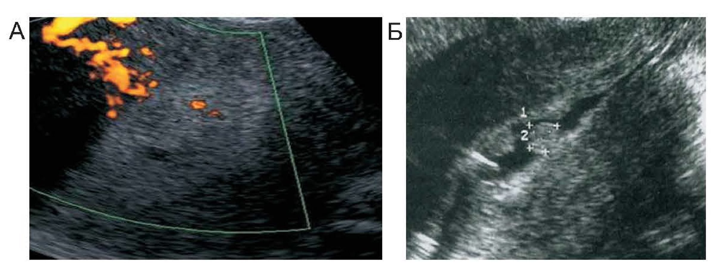 Рис. 2. Ультразвуковая картина изменений эпителия матки при длительно/и приеме тамоксифена