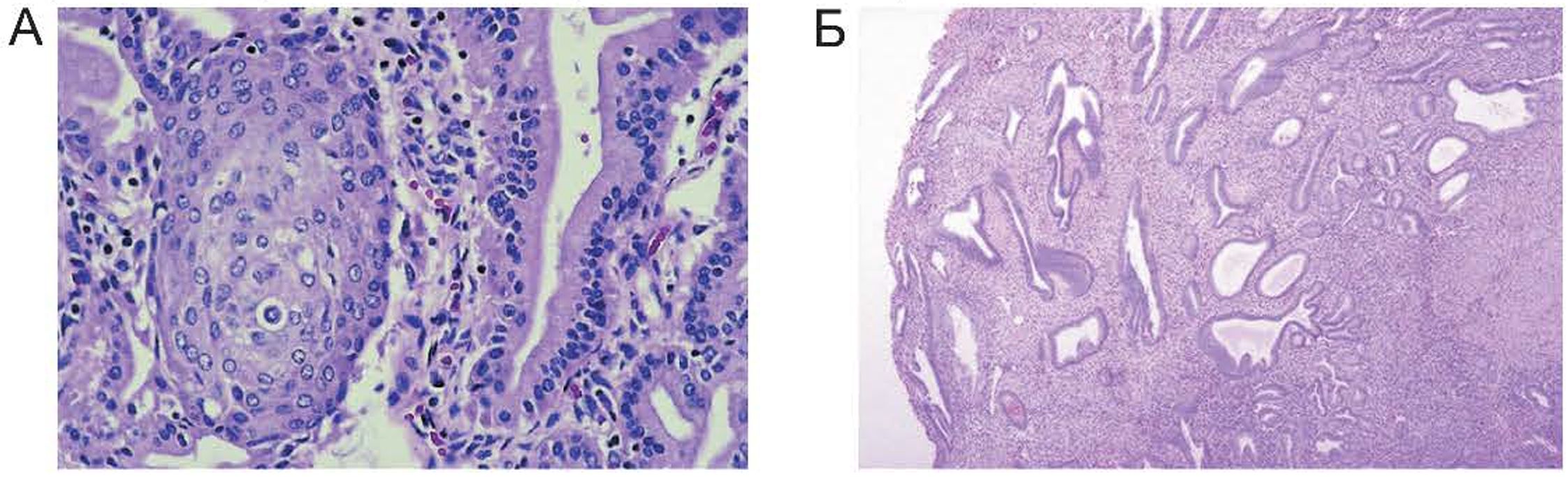 Рис. 3. А. — гиперплазия эндометрия, Б. — полип эндометрия у пациенток РМЖ, принимающих тамоксифен более 6 мес.