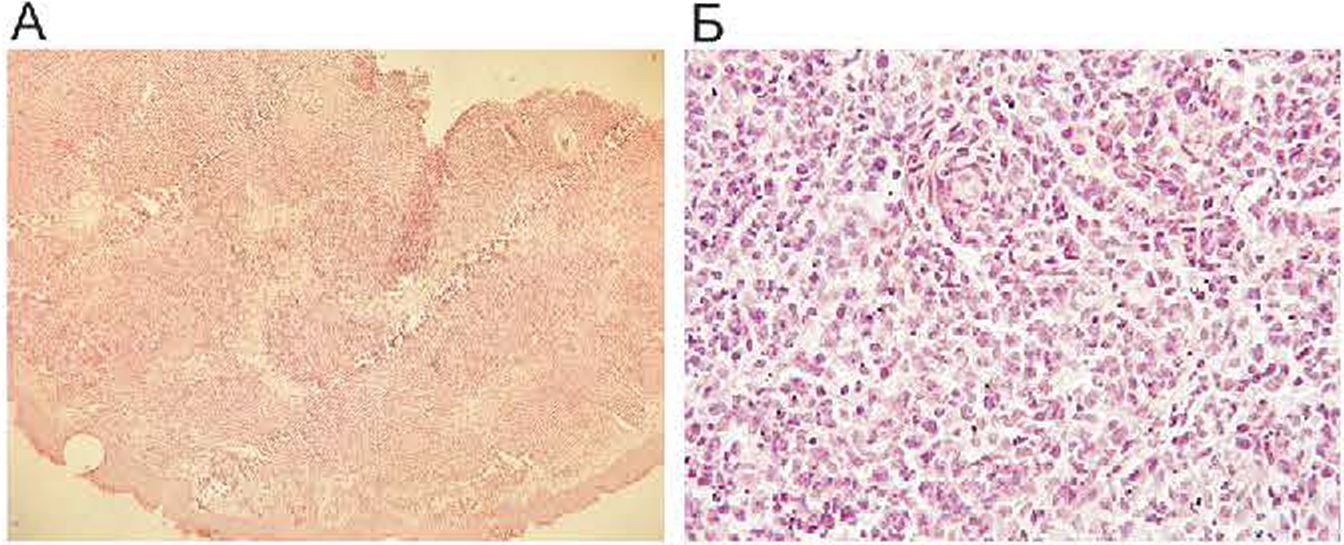 Гистологическое исследование биоптата кожи (окраска г е маток силином и эозином). А. Биоптат кожи с частичным сохранением рисунка и диффузной инфильтрацией глубоких слоев лимфоидными элементами (ок. 10, об. х4). Б. Инфильтрат представлен лимфоидными элементами мелких, средних и крупных размеров, с ядрами неправильной формы, сглаженным хроматином, нечеткими ядрышками (ок. 10, об. х40).
