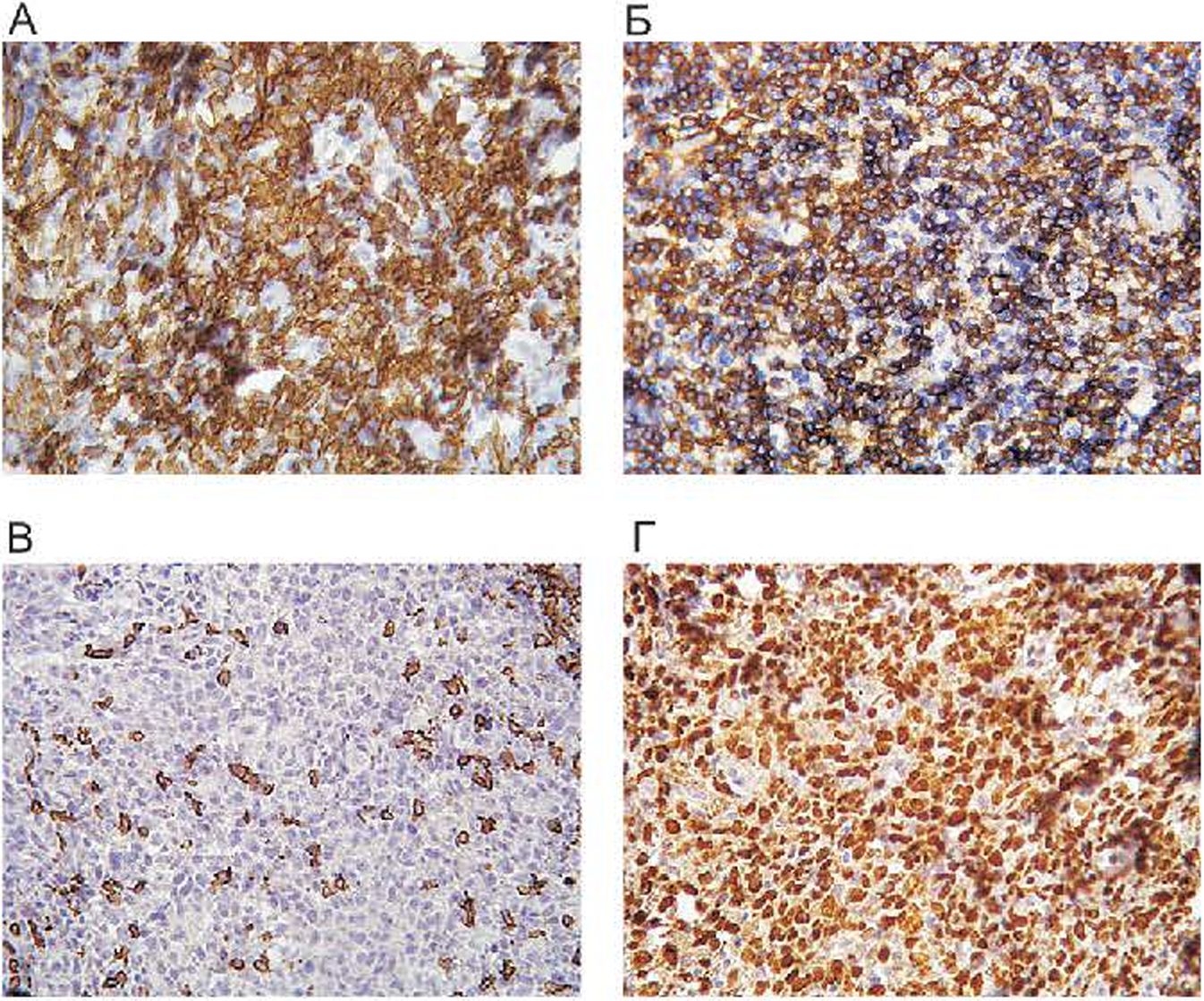 Иммуногистохимическое исследование биоптата кожи. Д. Экспрессия опухолевыми лимфоидными клетками CD3 (ок.10, об. х40). Б. Положительная реакция лимфоидных элементов с CD4 (ок.10, об. х40). В. Положительная реакция в реактивных СD20-позитивных лим - фоидных клетках (ок.10, об. х40). Г. Ядерное окрашивание опухолевых клеток с маркером пролиферации Ki-67 (ок. 10, об. х40).