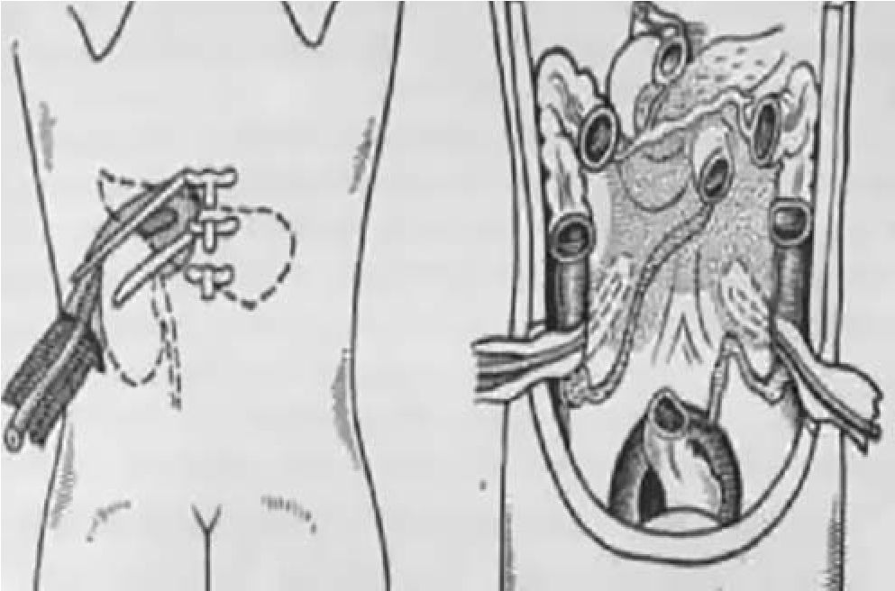 Рис. 3. Стандартные схемы дренирования забрюшинного пространства при флегмонах и абсцессах