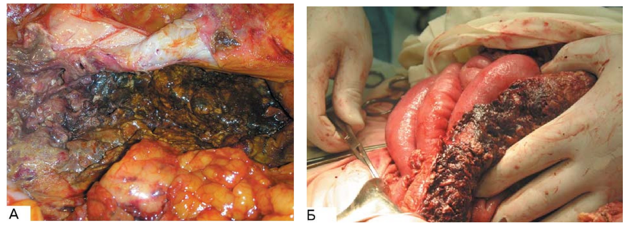 Рис. 4. Интраоперационный вид поджелудочной железы [А], некроз жировой ткани селезеночного изгиба толстой кишки (Б) при тотальном ПН