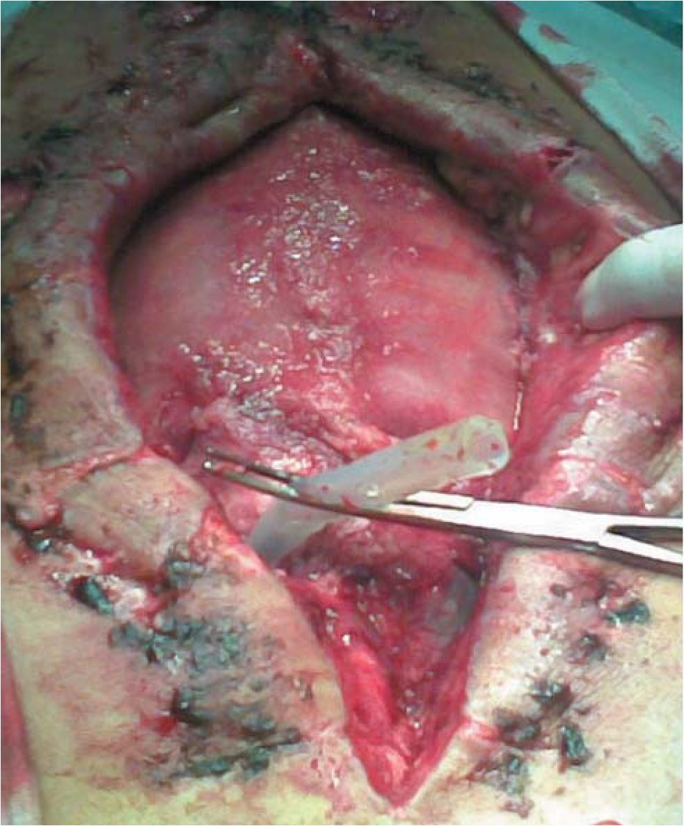 При выполнении санационных релапаротомий мы накладываем швы только на кожу с подкожно-жировой клетчаткой, что улучшает вентиляционные функции легких, позволяет избежать прорезывания швов апоневроза, а последующая операция по устранению послеоперационной грыжи намного проще в техническом исполнении, чем при деформированном с прорезанными краями апоневрозе [7]. Неоднократные санационные релапаротомии могут приводить к образованию хрящевидной ткани (оссификатов) по краям раны, что, вероятно, обусловлено контактом токсического выпота из брюшной полости с мягкими тканями передней брюшной стенки (рис. 6).