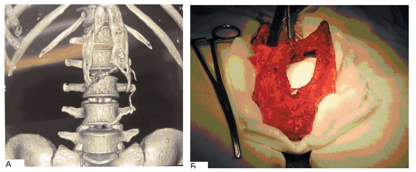 Рис. 6. Компьютерная томограмма: образование оссификатов по периметру апоневроза (А), макропрепарат иссеченного. оссификата (Б).