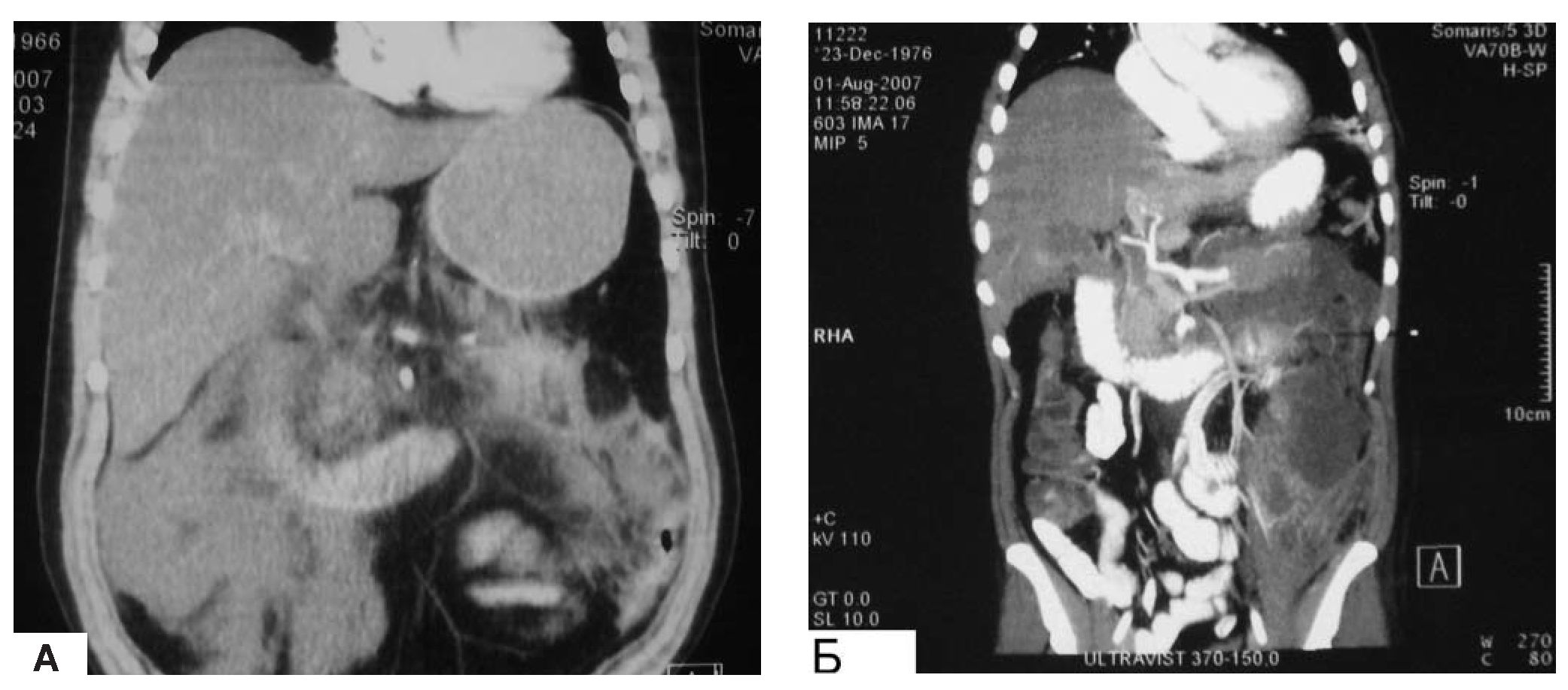 Рис. 7. Компьютерная томограмма при субтотальном инфицированном ПН, забрюшинной флегмоной справа (А) и слева [Б].