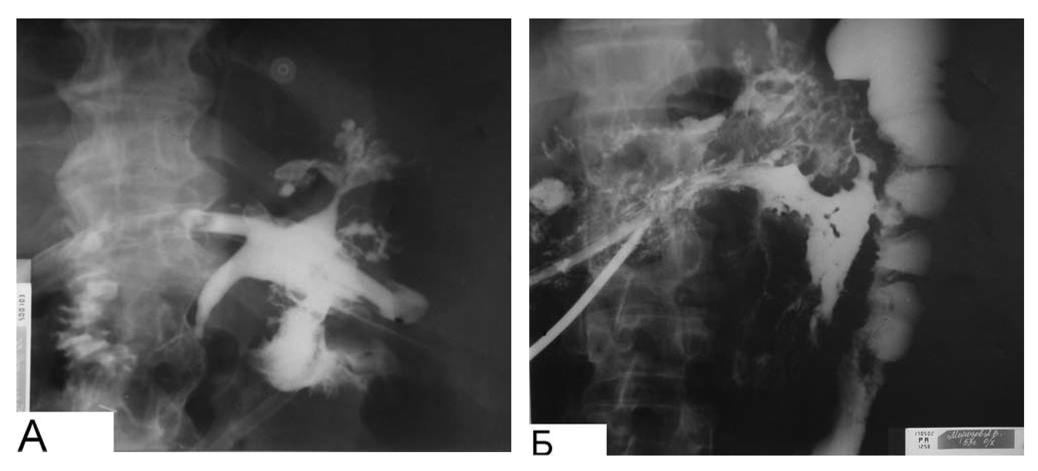 Рис. 8. Фистулотрамма при внутреннем тонкокишечном (А) и толстокищечтюм (Б) свищах