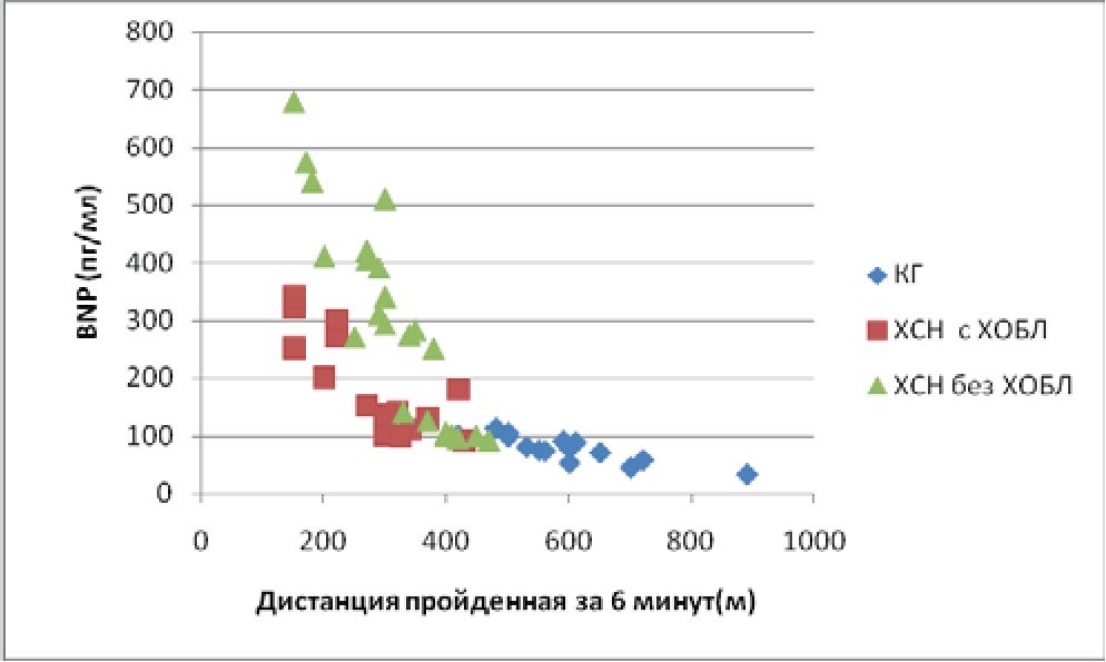 При проведении корреляционного анализа между показателями теста 6-минутной ходьбы и уровнем BNP была выявлена отрицательная высокодостоверная связь. Это говорит о том, что высокий уровень BNP характеризует низкую толерантность к физической нагрузке.