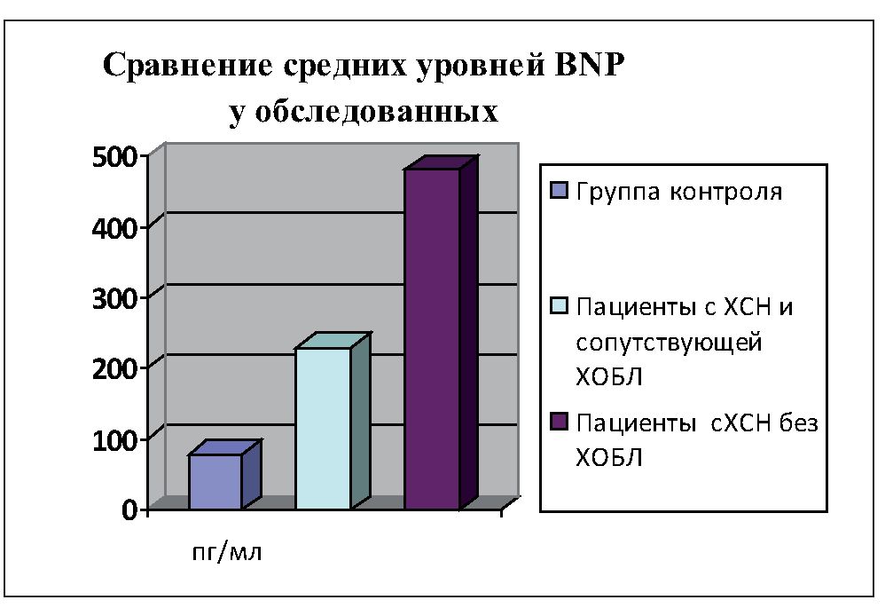 Результаты исследования показали, что уровень BNP увеличивается у больных ХСН, а степень повышения мозгового предсердного натрийуретического гормона отражает выраженность ремоделирования сердца у больных с хронической сердечной недостаточностью. Поэтому, показатель BNP может использоваться для дифференциальной диагностики одышки у пациентов ХСН и ХОБЛ.