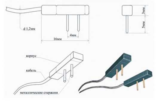 Датчик представляет два комбинированных миокардиальных электрода для четырехполюсного измерения. Небольшие размеры и форма электродов предусматривали его надежную фиксацию к миокарду. Корпус выполнен из композиционного материала, который обеспечивает герметичную конструкцию электрода. В нижней части корпуса расположены два стержня, из сплава благородных металлов. В конструкцию одного из электродов встроен термоэлемент для измерения температуры миокарда (рис. 1).