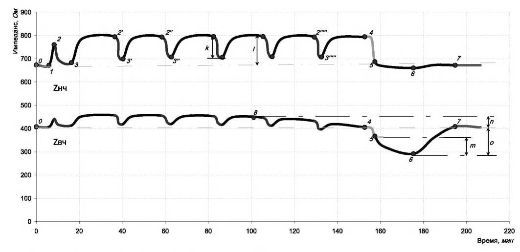 При анализе материала выявлены общие закономерности изменения электрического импеданса миокарда (рис. 3).