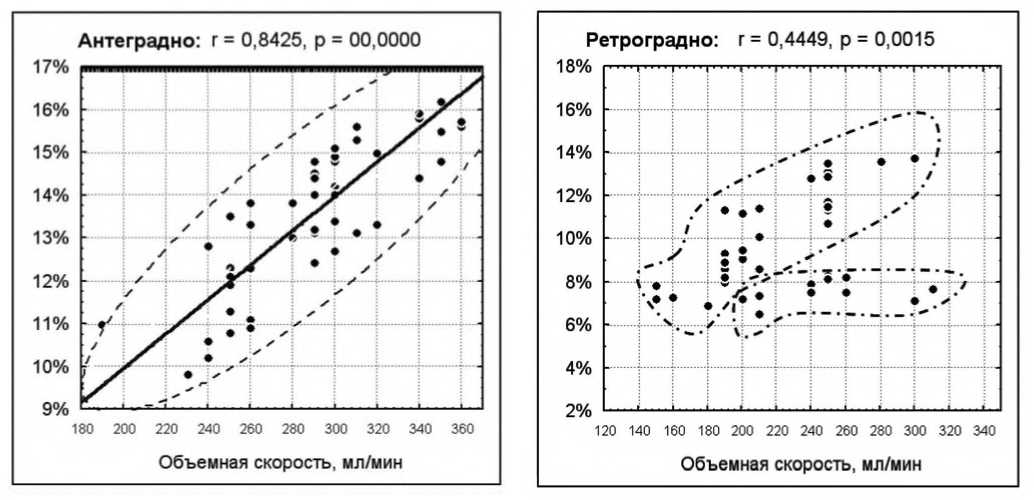 В случае с ретроградным введением раствора через коронарный синус, данные оказались не коррелируемы. Но при детальном разборе диаграммы рассеяния можно заметить разнородность данных, область которых помечена пунктирной линией (рисунок 4, справа). В подобных ситуациях низкая корреляция может быть следствием разбиения данных на две группы, а вовсе не отражать «истинную» зависимость между двумя переменными.